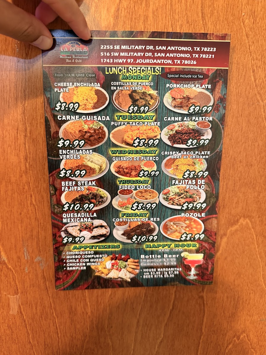 La Perla Bar & Grill, nestled in the heart of San Antonio at 516 SW Military Dr, is a vibrant destination that celebrates authentic Mexican flavors with a local Texas twist. From the moment you step inside, the aroma of freshly made corn and flour tortillas sets the stage for a memorable dining experience. The welcoming atmosphere is enhanced by live music, creating a warm and lively setting perfect for family gatherings, casual lunches, or spirited dinners.